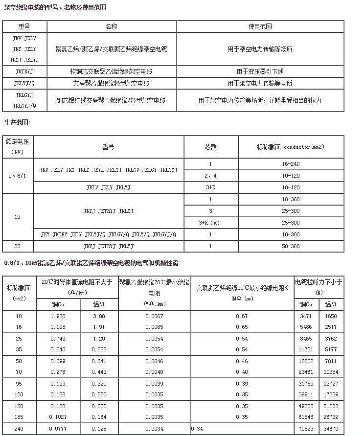 本產品適用于額定電壓35kV及以下的架空電力線路。電纜的機械性能和電性能符合國家標準GBl4049《額定電壓10kV、35kV架空絕緣電纜》和GBl2527《額定電壓1kV及以下架空絕緣電纜》。其中鋼芯鋁絞線交聯聚乙烯絕緣架空電纜的纜芯結構參照國標GB/T1179《圓線同心絞架空導線》,電纜的電性能和絕緣的機械物理性能符合國標GBl4049及GBl2527。