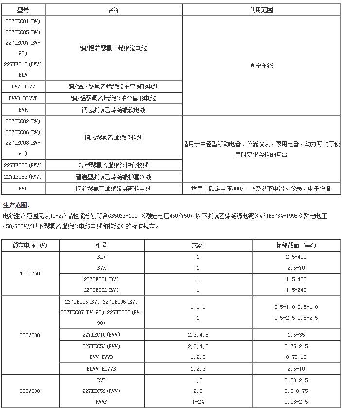 本產品適用于交流額定電壓450/750V及以下的家用電器、小型電動工具、儀器儀表及動力照明裝置電源連接,其型號、名稱及使用范圍見表。電線的工作溫度除BV—90、RV—90為90℃外,其余均為700℃。